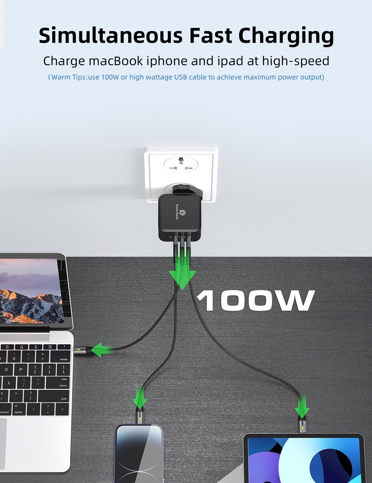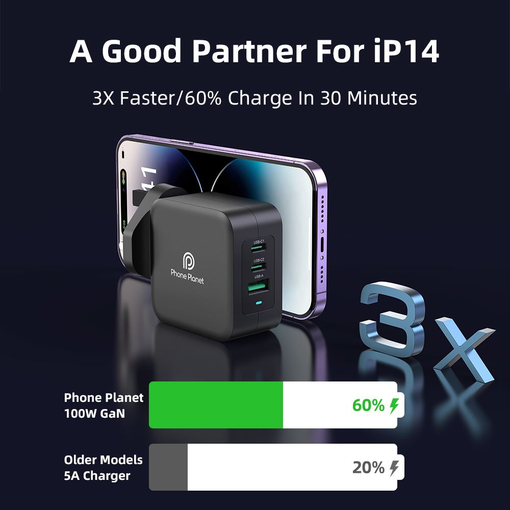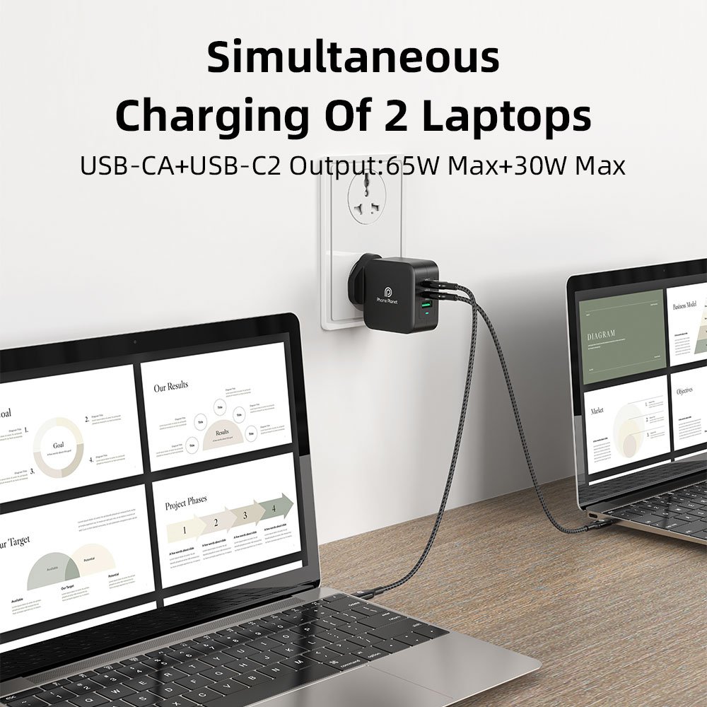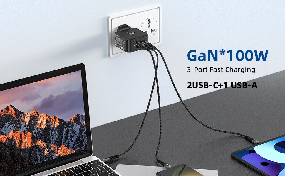 The PP-100W GaN-UK Charger is engineered with advanced GaN technology for ultra-fast, efficient, and safe charging. Its 2 USB-C ports + 1 USB-A port design allows simultaneous charging of multiple devices, making it ideal for laptops, tablets, and smartphones.